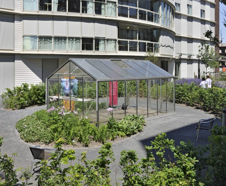 Goede buitenruimte is een voorwaarde voor kwalitatief hoogwaardig wonen in de stad. HOSPER heeft voor het Zonnehuisterrein in Amstelveen een autovrije, groene en levendige buitenruimte ontworpen. Op een expressief vormgegeven pleinvloer smeden diverse groene oases met weelderige beplanting en (speel-)voorzieningen de verschillende gebouwen aaneen. Aan de westkant zijn vier woongebouwen op een multifunctionele plin verrezen, naar ontwerp van Rijnboutt. In dit complex, De Ontmoeting, is een groenrijke patiotuin ontworpen.