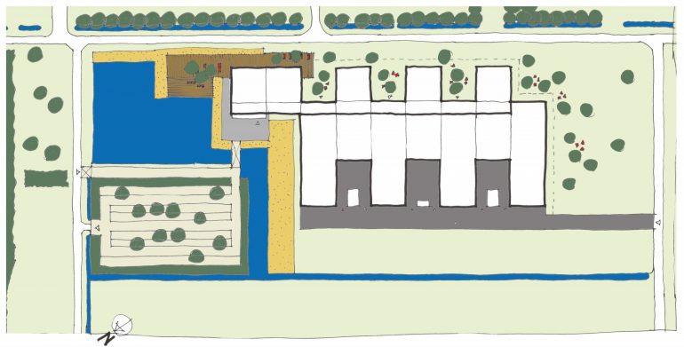 Vanuit het gebouw kan tussen en onder de laanbomen doorgekeken worden naar de achterliggende bosrand. Door de nabijheid van de esdoorns wordt de directe ruimte rond het gebouw gevoelsmatig afgebakend en ontstaat er een beschut gevoel. In de ruimte tussen het gebouw en de esdoorns wordt een boomgaardsfeer gecreëerd door fruitbomen in bloemrijk gras, met verspreid staande rode picknicktafels.