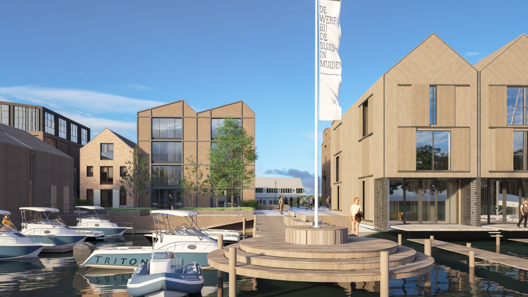 Ontwerp buitenruimte met vlonderdekken en aanlegsteigers op voormalig scheepswerf