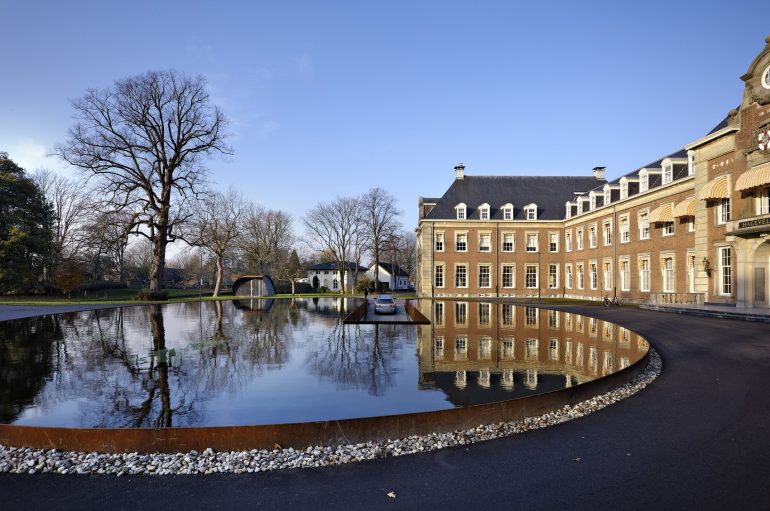 De kwaliteit van deze representatieve kant van het landgoed is behouden en versterkt door een grote nieuwe vijver aan te leggen waar de entree naar de parkeergarage ‘onzichtbaar’ doorheen snijdt. De vijver, met een wateroppervlak van 730 m² en 60 cm diepte, heeft een rand van CorTenstaal. In de vijver zijn lichtschachten opgenomen die voor daglicht in de parkeergarage zorgen. De openingen zijn afgedekt met gekleurde glaspanelen die elk afzonderlijk zijn vormgegeven als kunstwerk. Wanneer ’s nachts het licht vanuit de parkeergarage door deze panelen naar boven schijnt, ontstaat een bijzonder effect . Bovendien wordt het watervlak zo nu en dan verlevendigd door speciale fonteinen die kleine bubbels net boven de waterspiegel produceren.